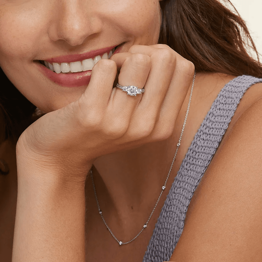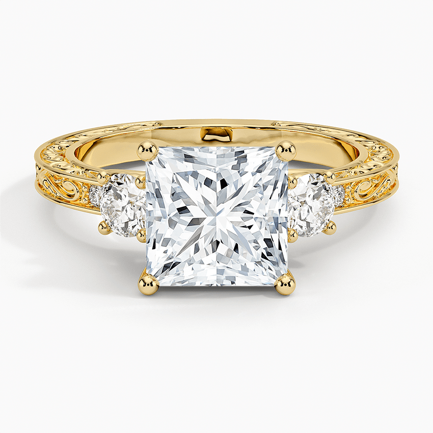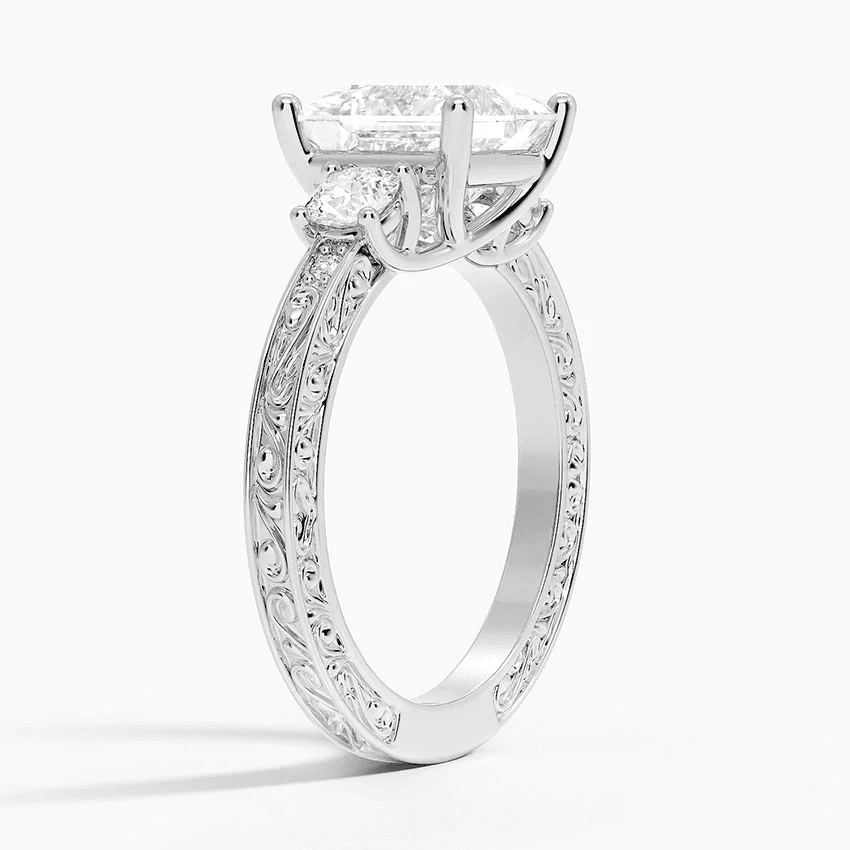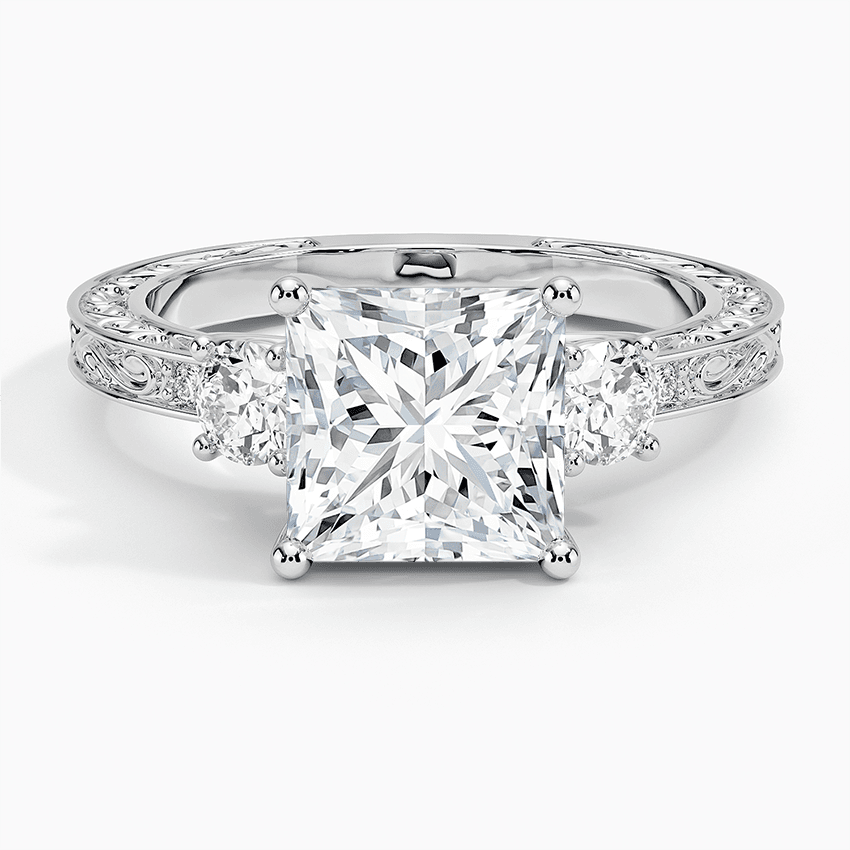 This exquisite antique style three stone trellis setting features interwoven prongs sweeping upward to embrace two brilliant round diamond side stones. The band is adorned with a beautiful scroll pattern on the top and sides, with each side accented by a single dazzling diamond (1/3 total carat weight).