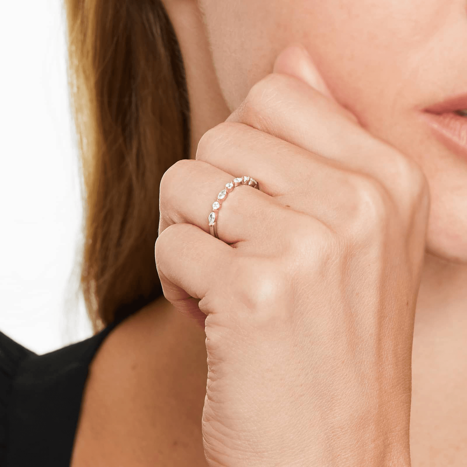 A romantic diamond ring with alternating marquise and round brilliant diamonds set in finely crafted shared prong settings.